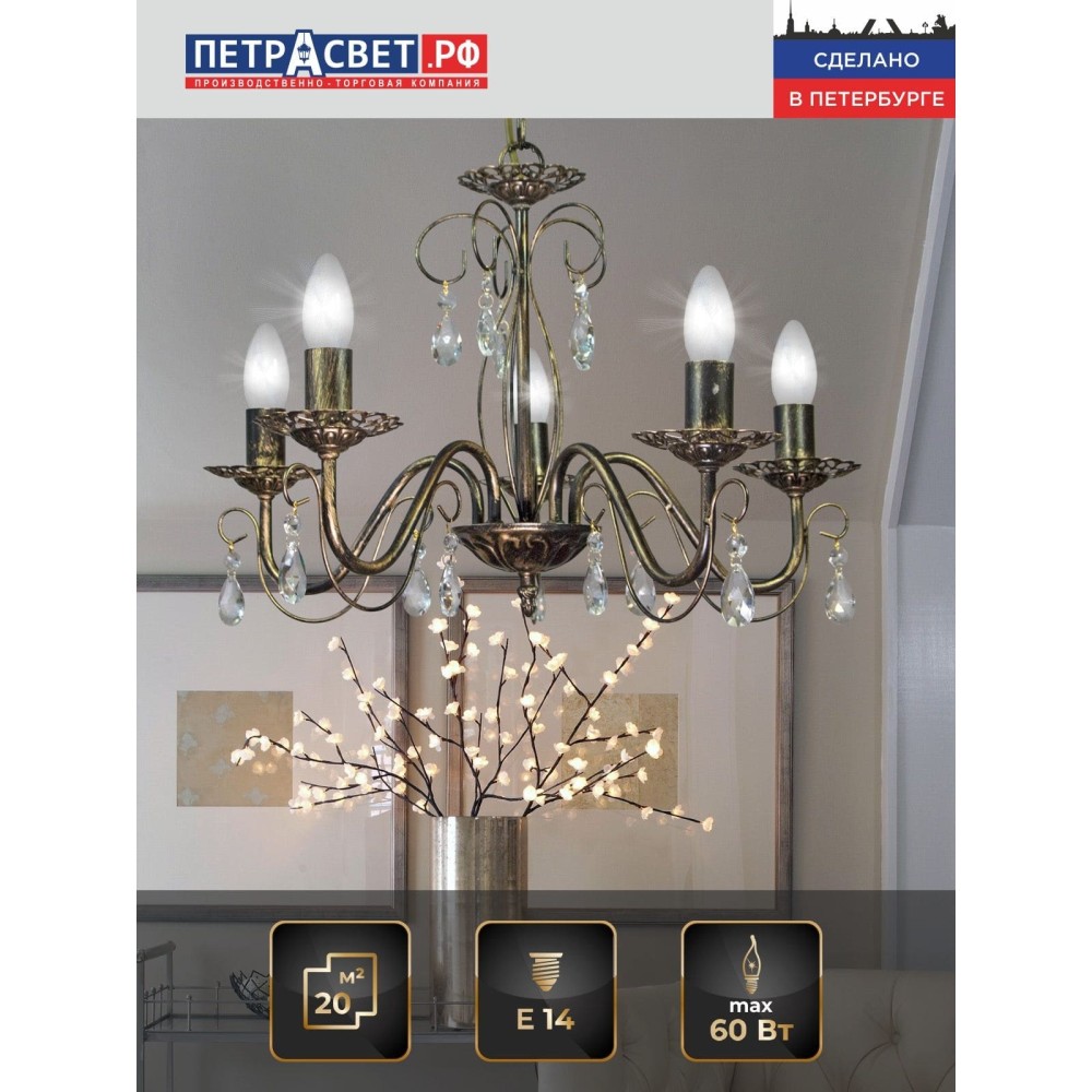 Люстра хрусталь 5 ламп Аврора черный с патиной золота российского производства ПЕТРАСВЕТ S1154-5, 5хЕ14 макс, 60Вт с хрустальными подвесками, цепь можно укоротить до 1 звена на 17 см, стиль - классика свечи, арматура - металл, цвет светильника- черный с патиной золота, размеры светильника (LxWxH) - 52x52x68, вес - 2 кг.