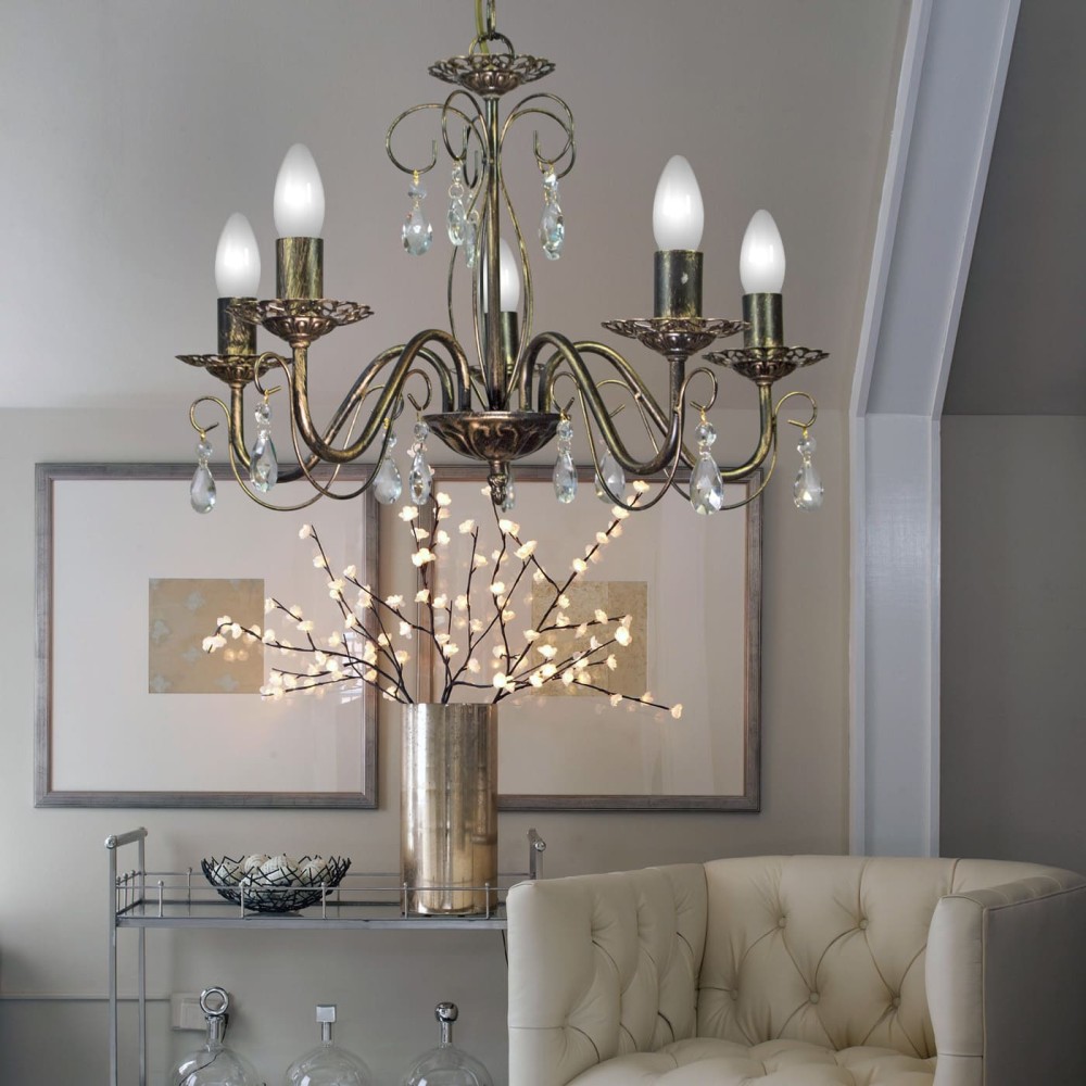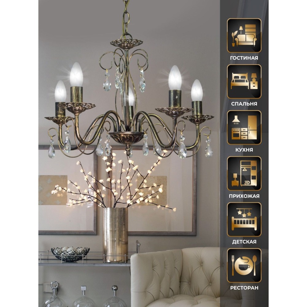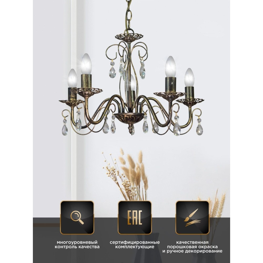 Главной особенностью этой люстры являются пять великолепных хрустальных подвесок, которые создают потрясающий эффект рассеянного света. Эти хрустальные элементы не только добавляют эстетическую привлекательность, но и эффективно распределяют свет, делая пространство более комфортным и уютным. Хрусталь, используемый в изготовлении подвесок, отличается высокой прозрачностью и превосходными светоотражающими свойствами, что обеспечивает яркое и равномерное освещение.