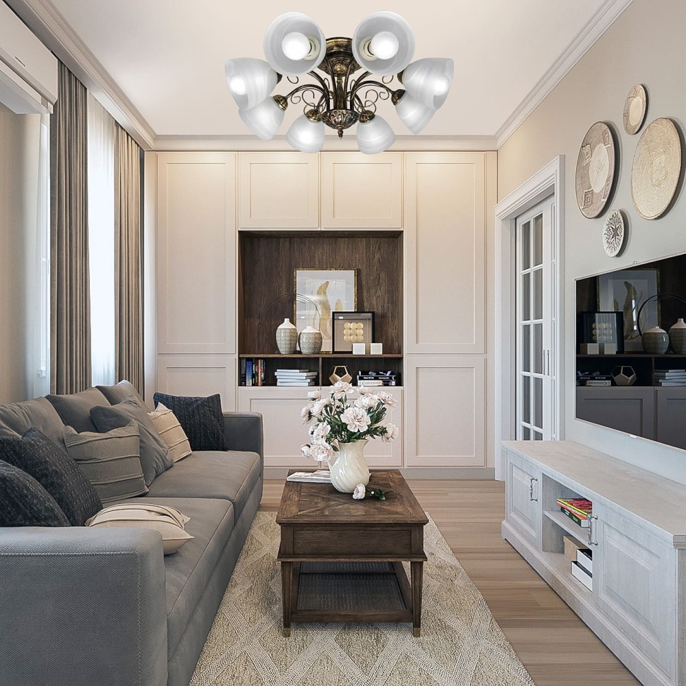 Стиль, сочетающий в себе элементы классики, неоклассики и прованса, делает эту люстру универсальной и подходящей для различных помещений – от гостиной и столовой до спальни и коридора.